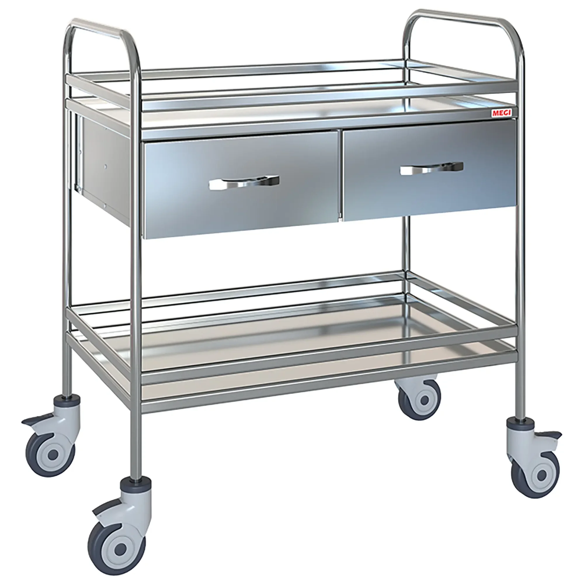Столик комплектуется двумя поддонами и выдвижными ящиками из нержавеющей стали.