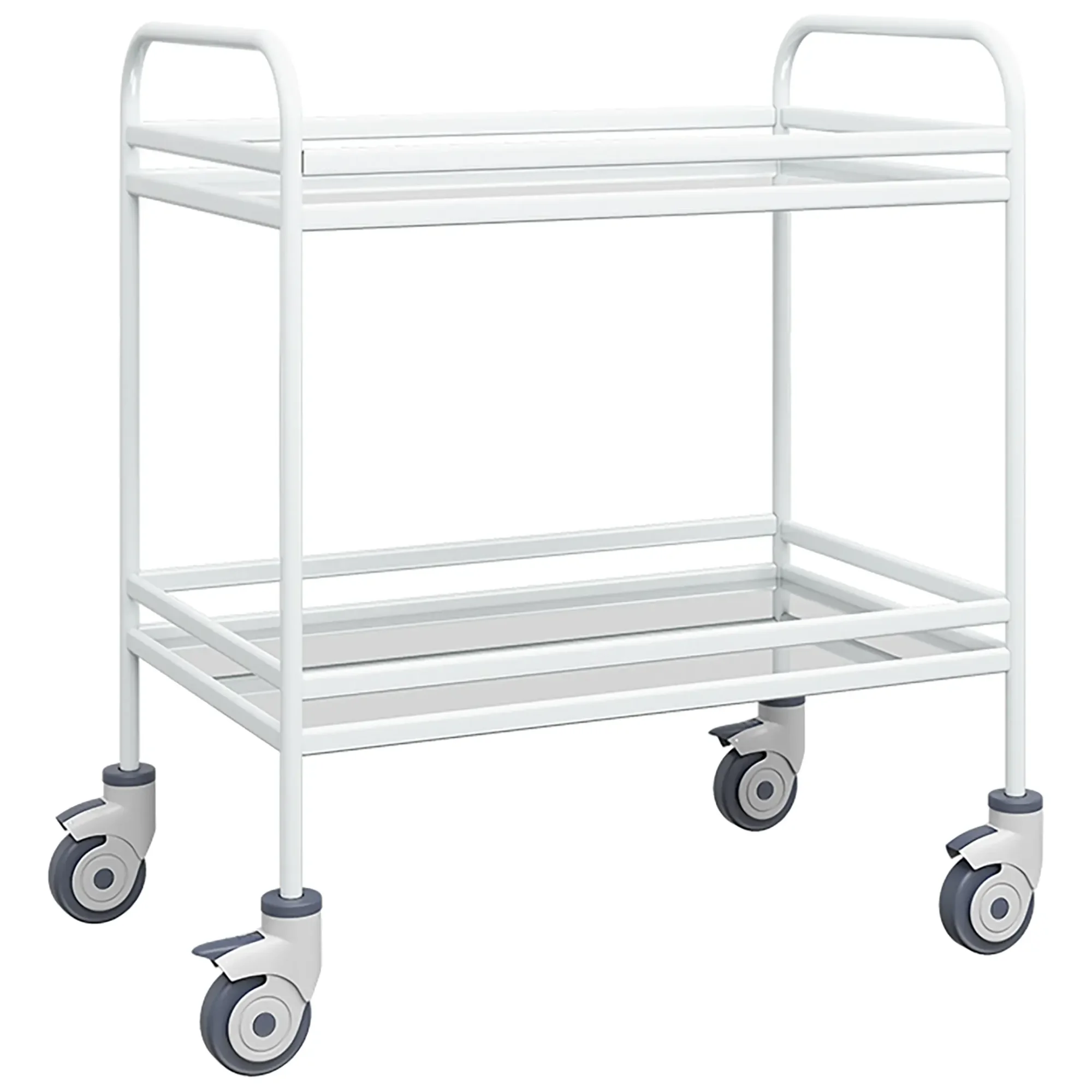 • колеса поворотные, самоориентирующиеся, диаметром 100 мм, комплектуются надёжной стальной вилкой с прецизионным радиально-упорным подшипником, ободом из полипропилена и шинкой из серого полиуретана, не оставляющего следов на полу (два колеса – с индивидуальным тормозным устройством).