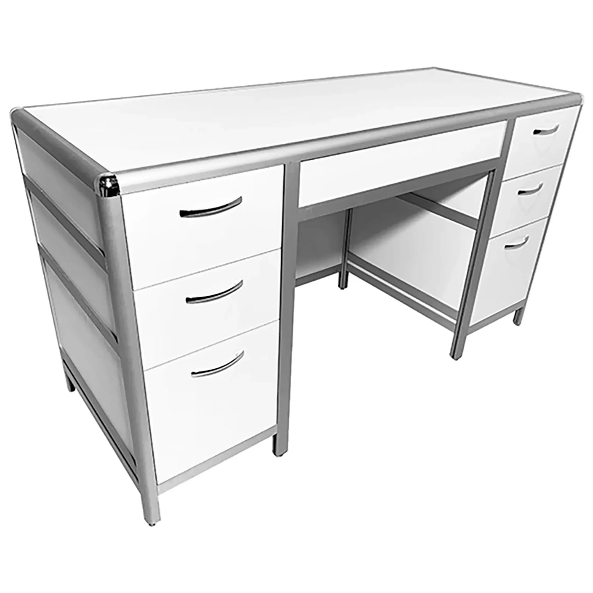 Стол лабораторный MED 10.007al (белый) представляет собой идеальное решение для организации продуктивного и удобного рабочего места сотрудников в лабораториях и медицинских учреждениях. Модель оснащена двумя боковыми тумбами, каждая с тремя выдвижными ящиками. Каркас выполнен из алюминиевого профиля, столешница из ЛДСП толщиной 16 мм.