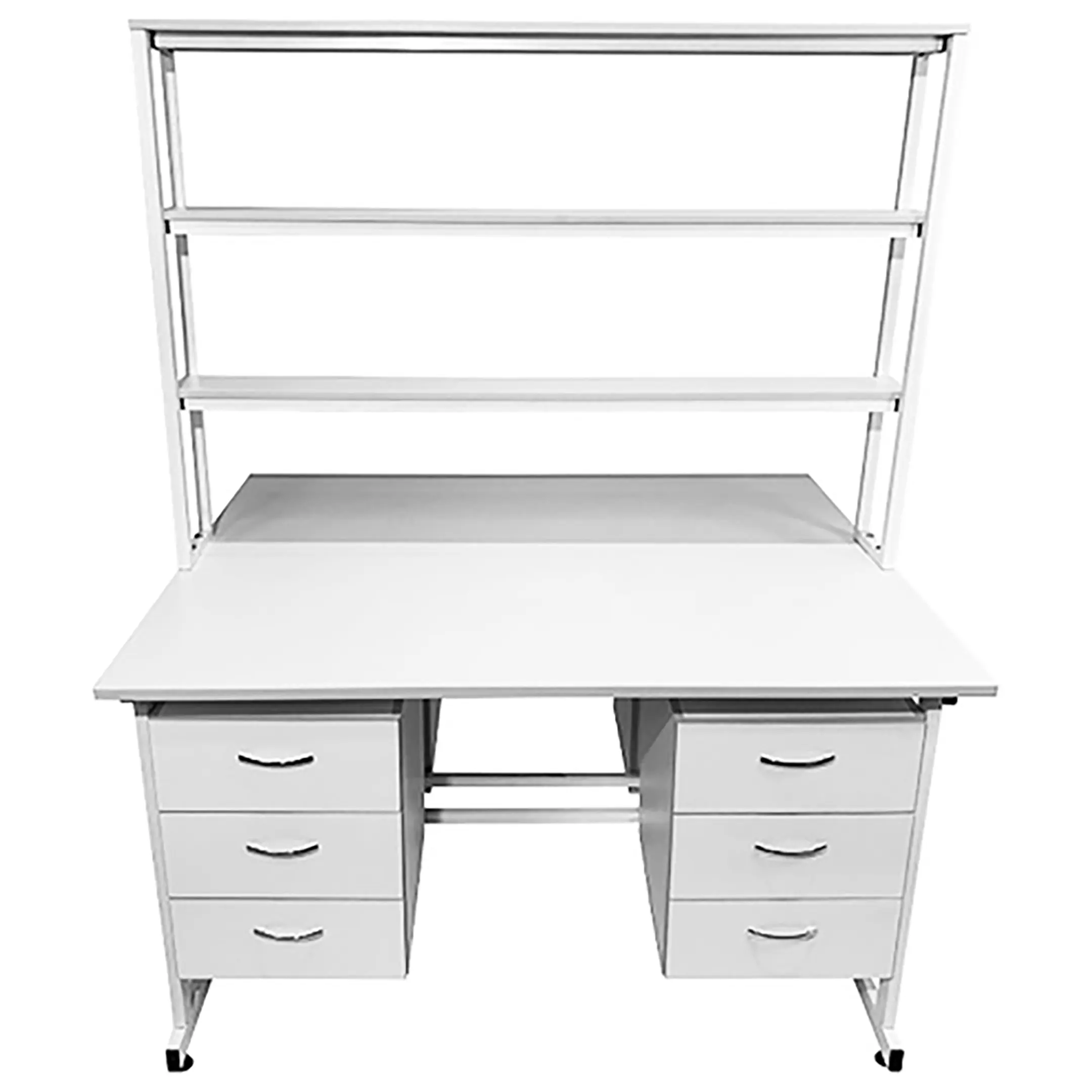 Стол лабораторный островной с надстройкой Сло 22.023 (белый) — это эффективное и удобное решение для организации двух рабочих мест в лабораториях или медицинских учреждениях. Модель оснащена двумя рабочими местами, каждое с двумя подвесными тумбами, имеющими три выдвижных ящика, и центральной надстройкой с тремя полками. Каркас выполнен из стального профиля, столешницы из ЛДСП толщиной 22 мм.