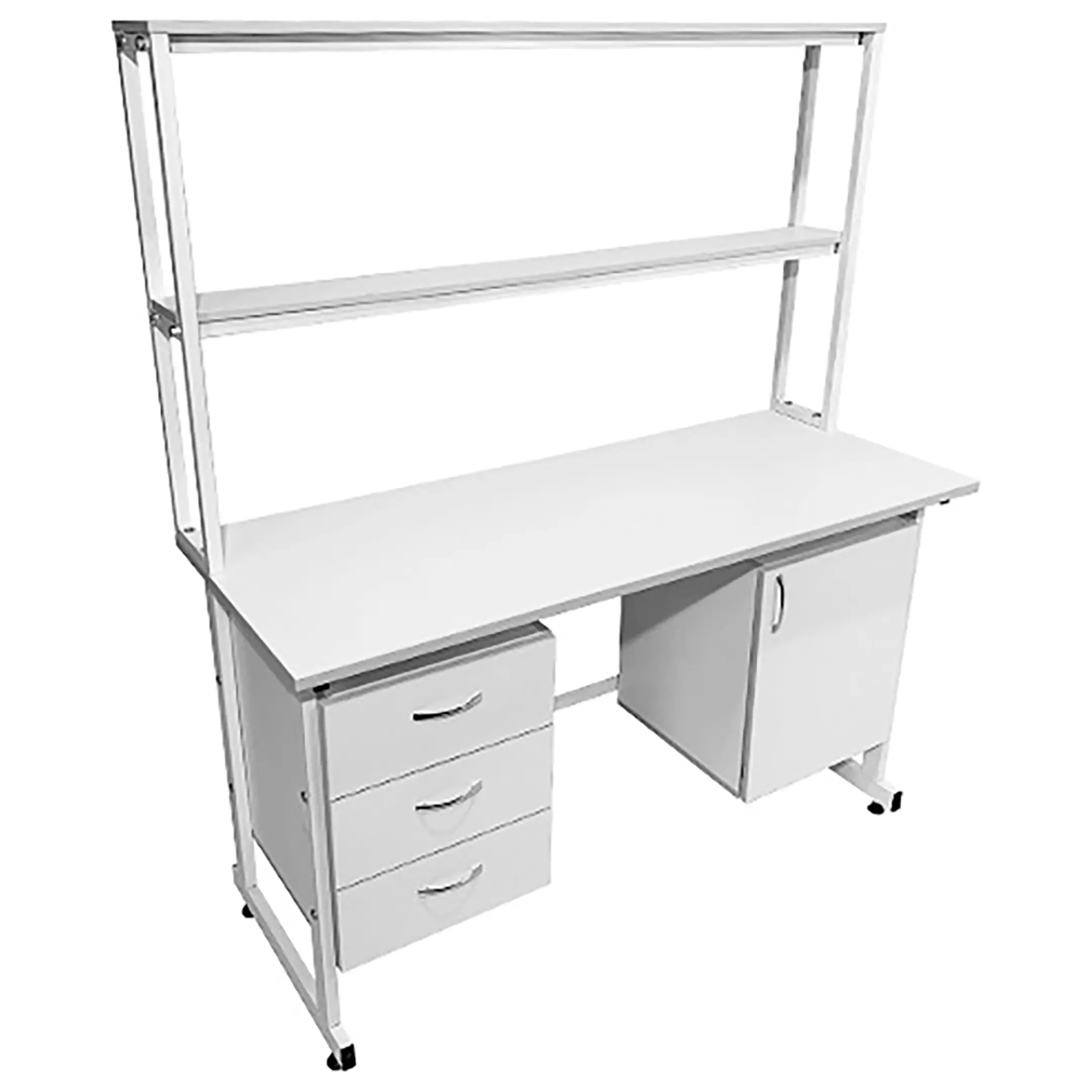Стол лабораторный с надстройкой СЛн 16.016 (белый) — это идеальное решение для организации эффективного и комфортного рабочего места лаборанта, занятого проведением химических исследований в лабораториях и медицинских учреждениях. Модель оснащена подвесными тумбами: слева с тремя выдвижными ящиками, справа с распашной дверкой и полкой, надстройкой с двумя полками и металлическим защитным экраном. Каркас выполнен из стального профиля, столешница из ЛДСП толщиной 22 мм.