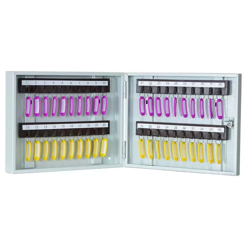 - Готовая система для быстрой организации учета — сорок пронумерованных ячеек и комплект брелков создают понятную и наглядную систему. Это позволяет моментально начать систематизацию, мгновенно находить нужный ключ и вести простой учет их выдачи, что экономит время и поддерживает порядок.