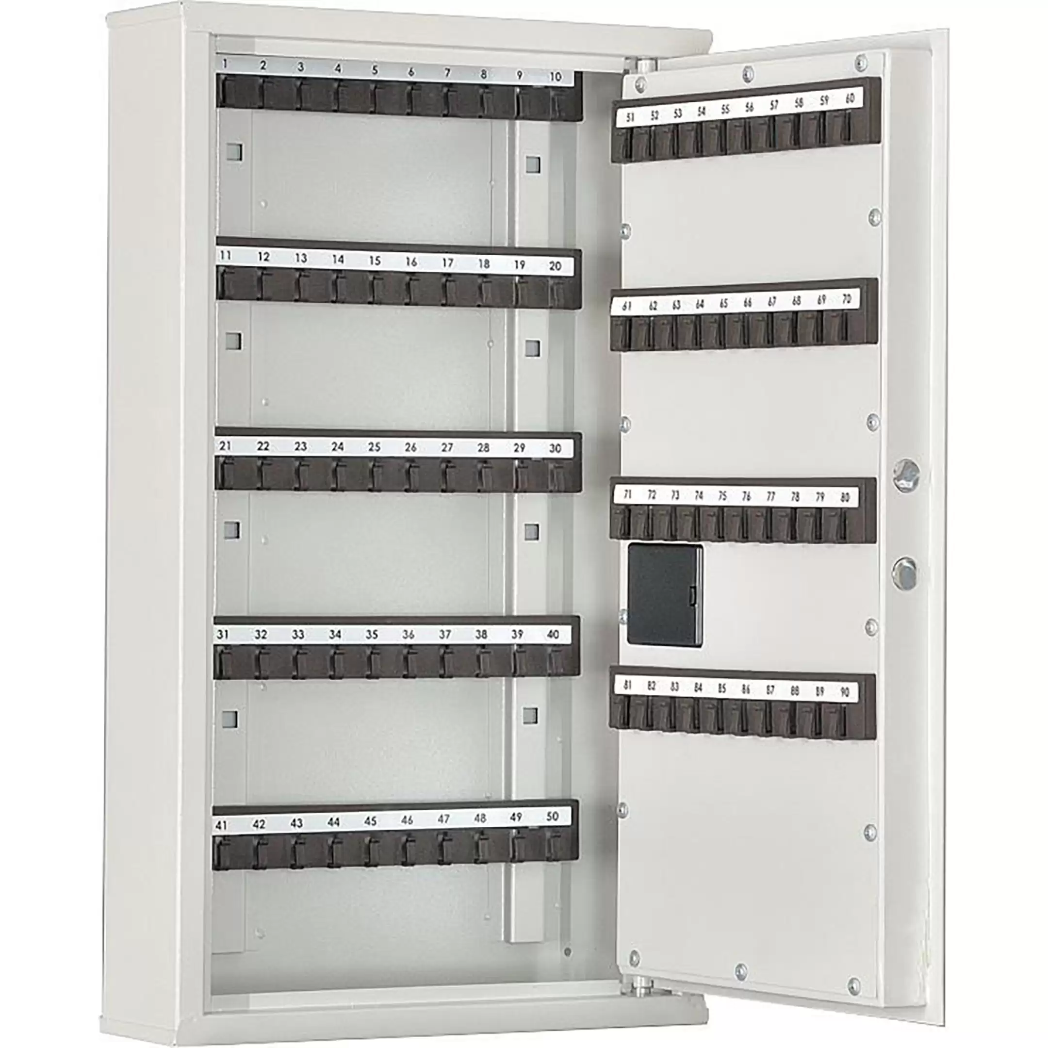 - Вместительность и удобная организация хранения — система комплектуется 9 планками для навески, что позволяет упорядоченно разместить до 90 комплектов ключей. Это оптимальное решение для крупных отделов, смен или объектов с обширным ключевым хозяйством.