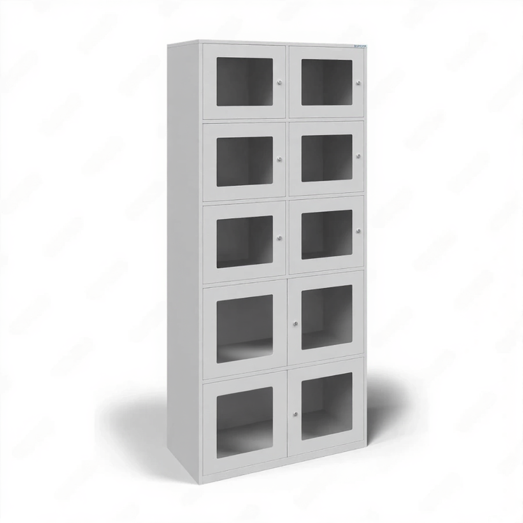 - Визуальный контроль и оперативность обслуживания — прозрачные окошки на каждой ячейке позволяют сотрудникам быстро идентифицировать содержимое, проверять наличие предметов и состояние ячеек без необходимости их открывания, что значительно ускоряет процессы выдачи и приема.