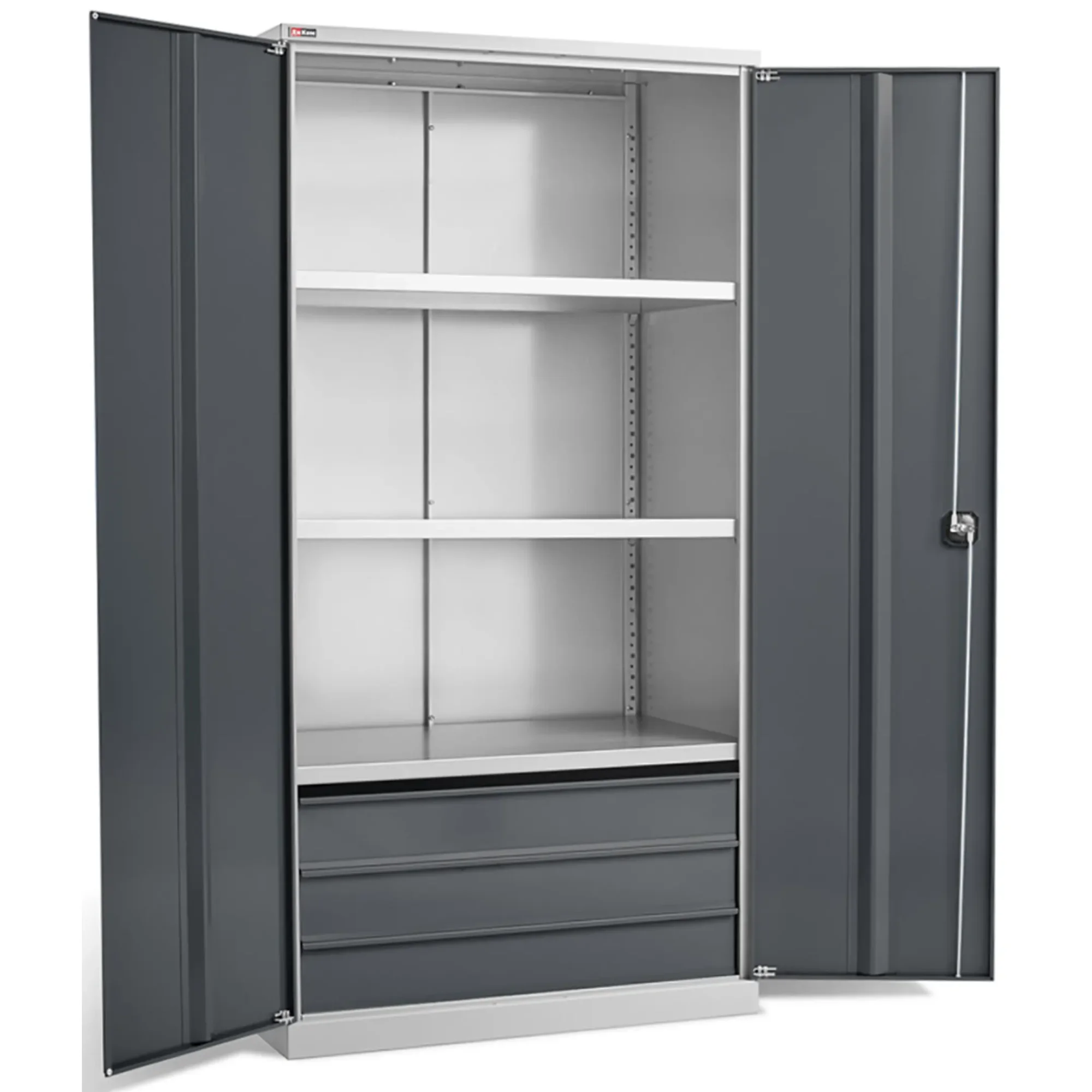 - Прочность и долговечность — шкаф изготовлен из качественной стали и покрыт износостойкой порошковой краской, устойчивой к механическим воздействиям, царапинам и условиям, типичным для мастерских. Конструкция рассчитана на длительный срок службы при активной эксплуатации.