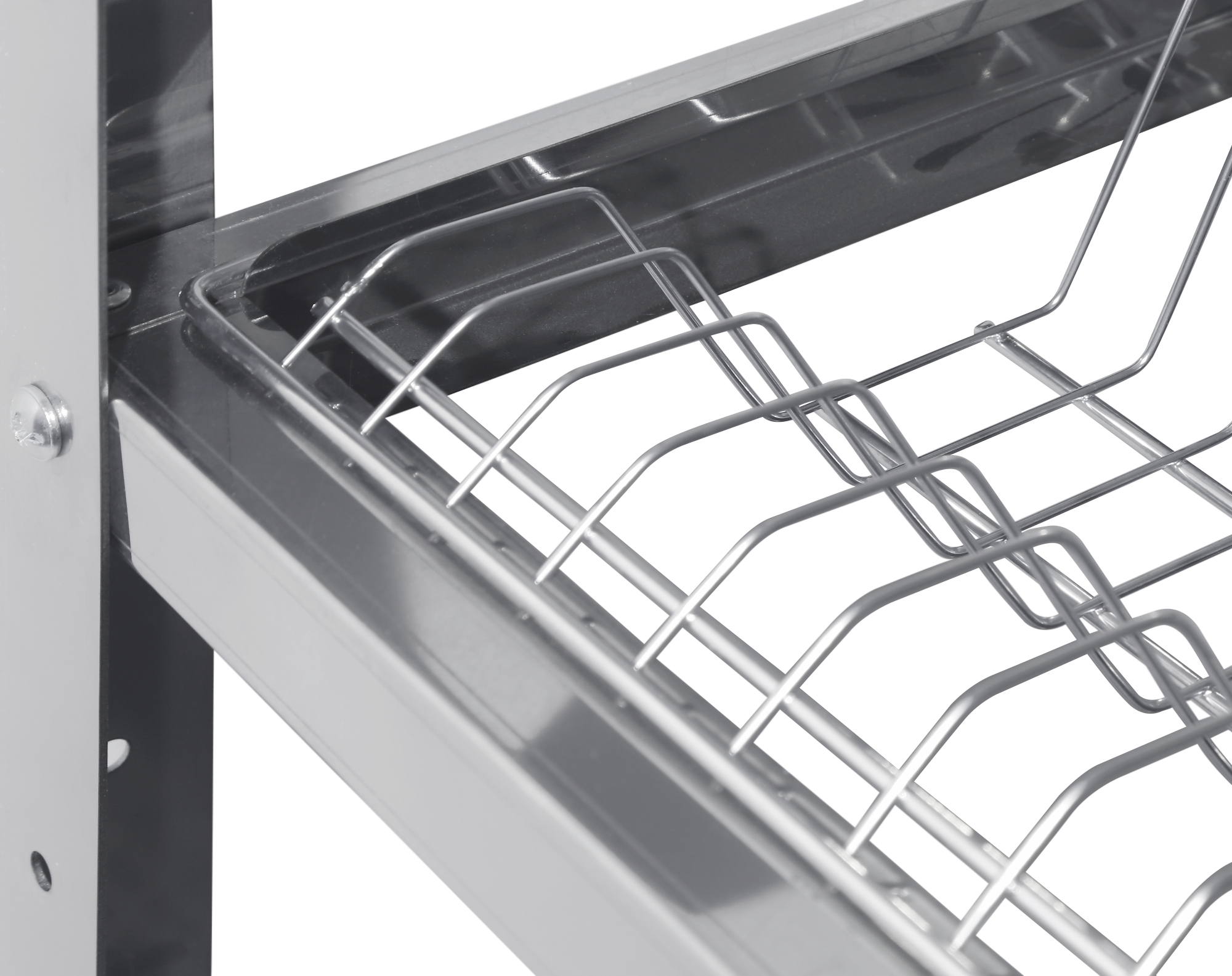 5 полок (сверху-вниз: верхняя сплошная, 3 полки для посуды, перф.полка для сушки стаканов) + поддон-полка с углублением для сбора стекающей воды.