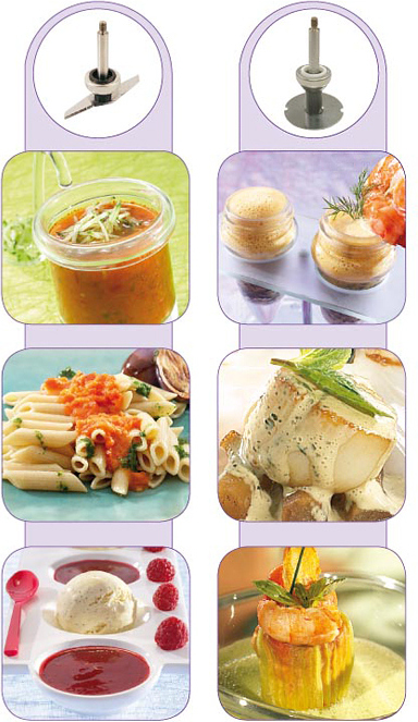 Модель поставляется в расширенной комплектации, в которую входят нож и съемные разборные насадки: насадка с системой герметичности с 3-мя уровнями, диск-взбиватель и насадка из нержавеющей стали.