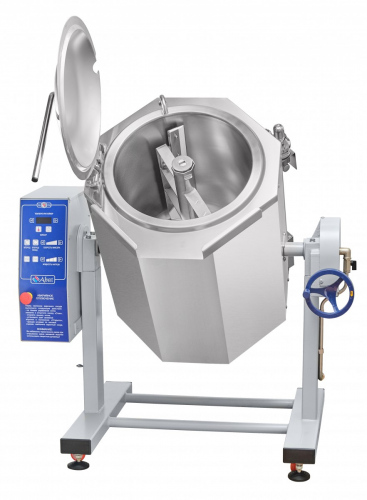 Котел с функциями перемешивания и ручного опрокидывания предназначен для приготовления бульонов, первых, вторых и третьих блюд. Объем варочного сосуда составляет 60 литров, корпус и сосуд выполнены из нержавеющей стали AISI 304.