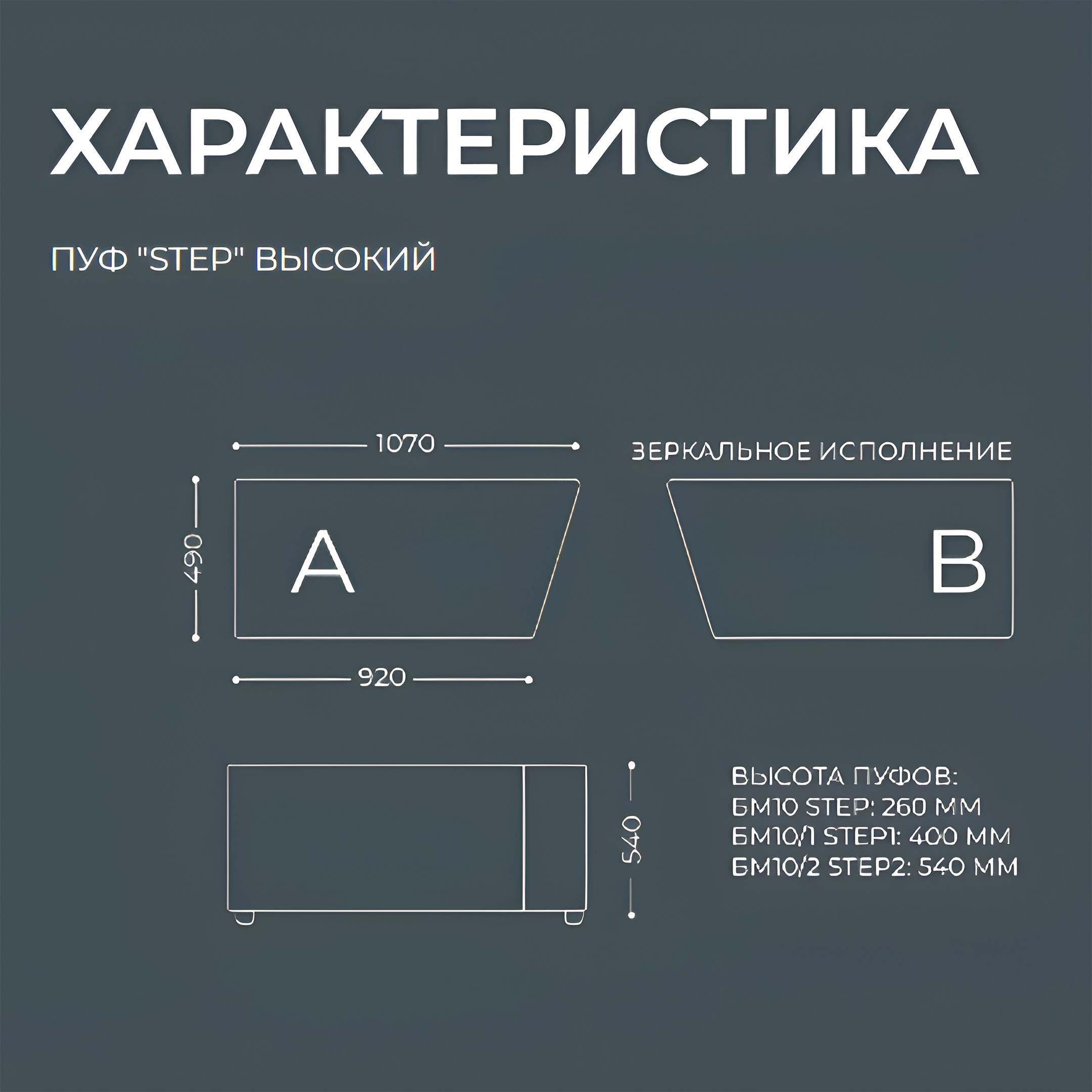 Пуфы серии STEP доступны в левом и правом вариантах исполнения (А и В). Каркас оббит яркой и тактильно-приятной искусственной кожей/экокожей. Пуф также оснащен пластиковыми опорами для устойчивости. Подобная мебель легко встраивается в ряды или любые  конфигурации интерьера в зависимости от назначения и целей.