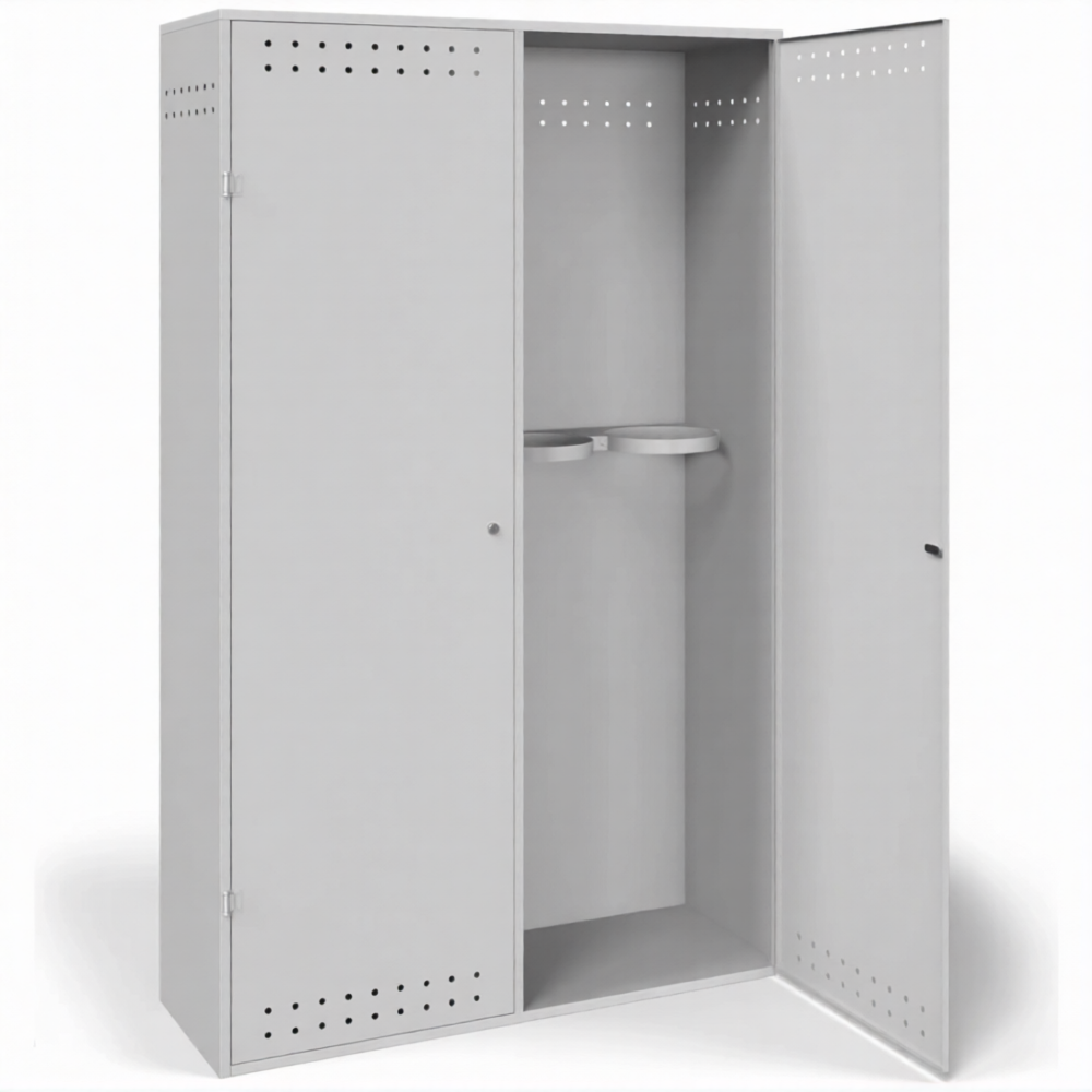 - Обеспечение требований пожарной безопасности — металлический корпус изолирует баллоны от возможных источников возгорания, искр и тепла. Наличие системы естественной вентиляции (перфорация или вентиляционные решетки) предотвращает образование взрывоопасной концентрации газа в случае микроутечки, что строго соответствует нормам ППР в РФ.