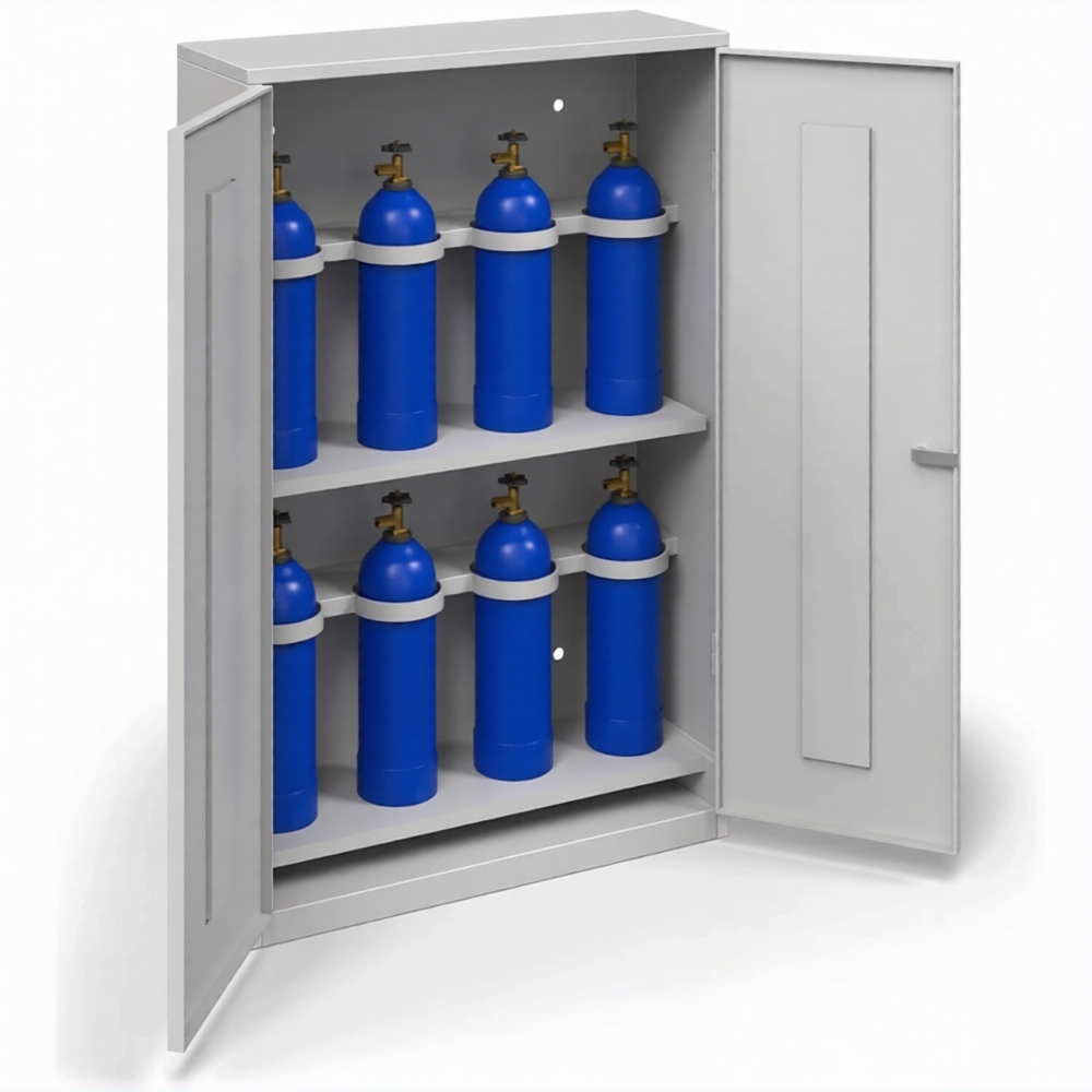 - Надежная защита имущества и организованное хранение — запирающаяся дверь защищает баллоны от краж и несанкционированного доступа. Узкий шкаф позволяет навести порядок и безопасно хранить баллоны в местах, где они раньше могли стоять незакрепленными, создавая угрозу.