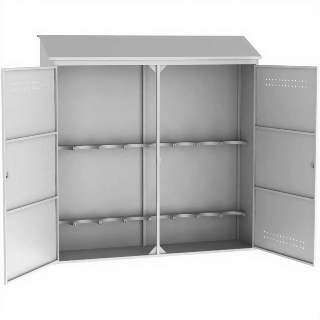 - Большая вместимость и надежная конструкция — шкаф специально сконструирован для безопасного хранения до восьми газовых баллонов. Усиленная конструкция из толстолистовой стали и жесткий каркас обеспечивают устойчивость и долговечность даже при полной загрузке, надежно фиксируя баллоны внутри.