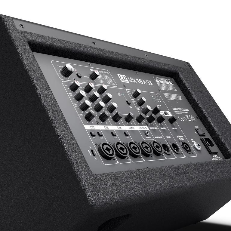 Возможно подключение широкого спектра источников входного сигнала, включая электромузыкальные инструменты, смартфоны, планшеты, MP3 и CD-плееры. Встроенный микшер оснащен 3 микрофонными каналами с 2-полосным эквалайзером и фантомным питанием 48 В. Выходная секция включает в себя 3-полосный мастер-эквалайзер для общей корректировки тона, 4-сегментный светодиодный индикатор и выходы XLR для монитора и сабвуфера. Кроме того, MIX 10 A G3 оснащен DSP с 16 пресетами цифровых эффектов, лимитером и системой защиты от перегрузки по току и короткого замыкания. Выход SpeakON позволяет подключать дополнительную пассивную систему MIX 10 G3. Прочный корпус изготовлен из фанеры с углом 50° для использования в качестве сценического монитора и «стаканом» под стойку с наклоном 0° или 5°. MIX 10 A G3 обеспечивает высокую производительность и универсальность применения в легком корпусе.